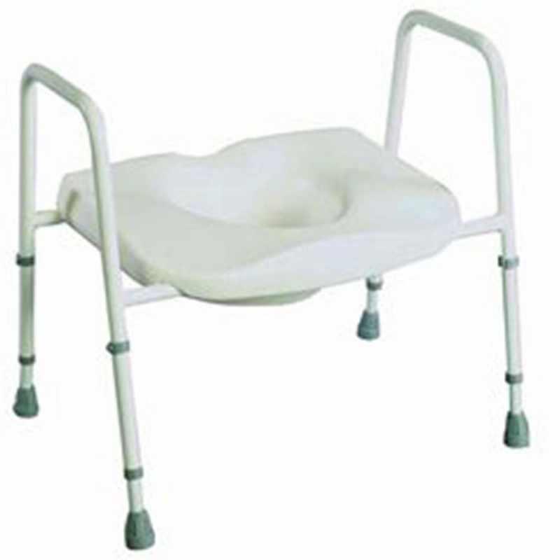 • Sturdy, extra wide and height adjustable metal frame with armrests and integral seat designed to be positioned over the toilet to raise height for easier transfers on and off