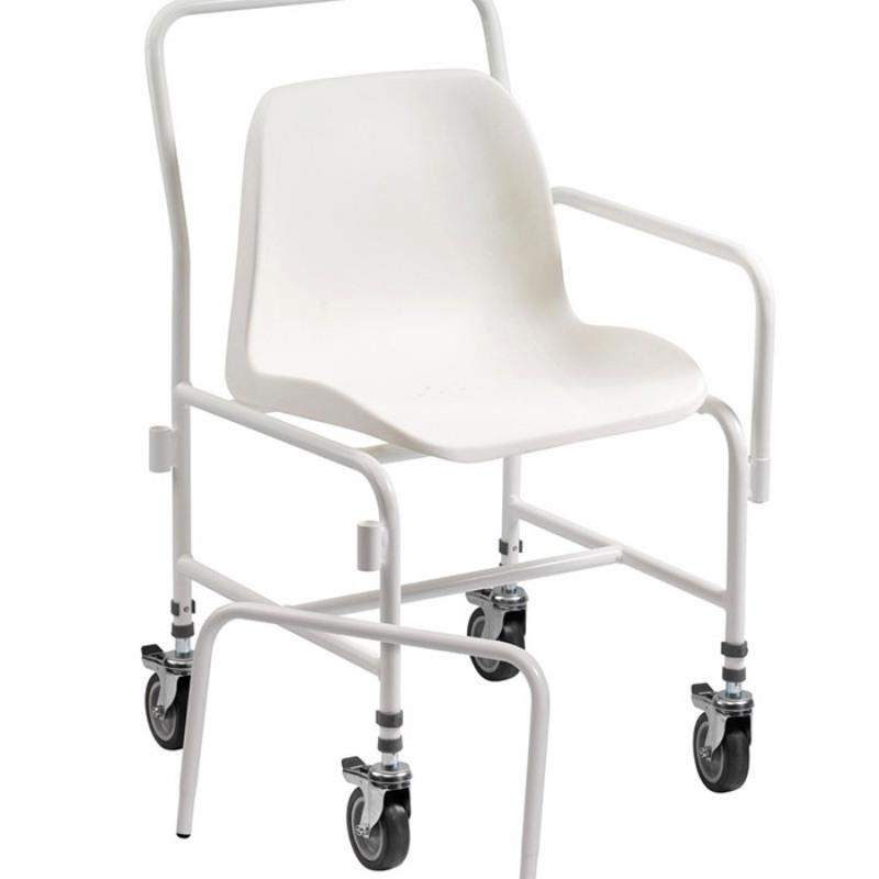 • Adjustable height wheeled shower chair with backrest and armrests for increased support